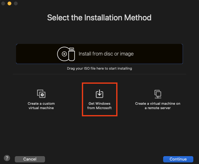 Nyní vytvoříme nový virtuální počítač s operačním systémem Windows 11. V okně Select the Installation Method vybereme možnost Get Windows from Microsoft a klikneme na tlačítko Continue: