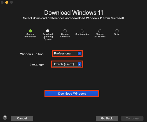 Tím si ušetříme práci s ručním stahováním instalačního obrazu Windows 11 a následným nastavováním. Aplikace vše zařídí automaticky za nás. V okně Download and Install Windows 11 opět klikneme na Continue, poté z nabídky vybereme verzi Windows Professional, jazyk změníme na Czech (cs-cz) a zahájíme stahování operačního systému kliknutím na Download Windows: