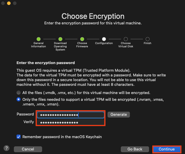 Jakmile se stahování dokončí, klikneme několikrát na Continue, dokud se nedostaneme k oknu Choose Encryption. Zde si zvolíme heslo, kterým budou data našeho virtuálního počítače šifrována, a přejdeme na další nastavení pomocí Continue: