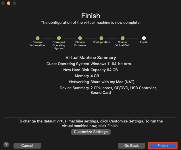 V okně Choose Virtual Disk ponecháme vybranou možnost Create a new virtual disk a klikneme na Continue. V okně Finish vidíme shrnutí parametrů virtuálního počítače: