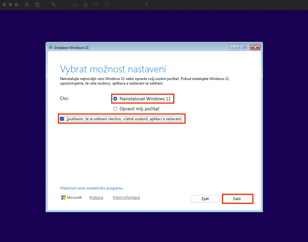 Při instalaci ponecháme vybranou možnost Nainstalovat Windows 11, zaškrtneme souhlas a zase klikneme na tlačítko Další: