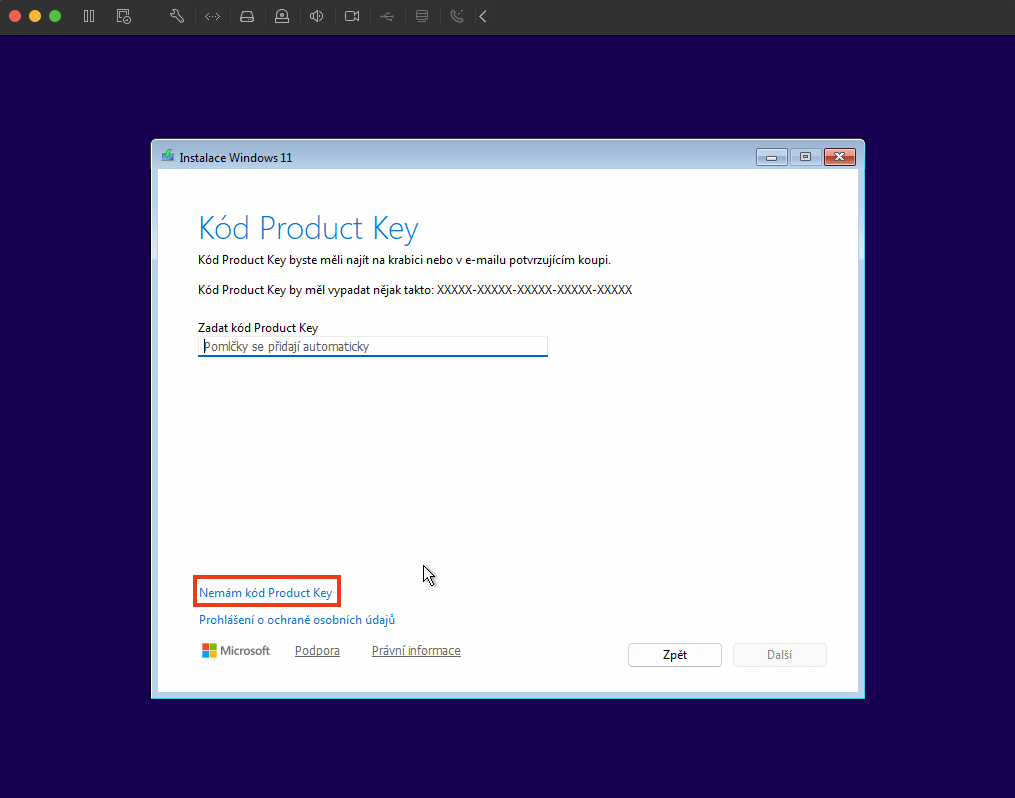 Pokud máme produktový klíč k Windows 11, zadáme ho v dalším okně. V opačném případě klikneme na možnost Nemám kód Product key: