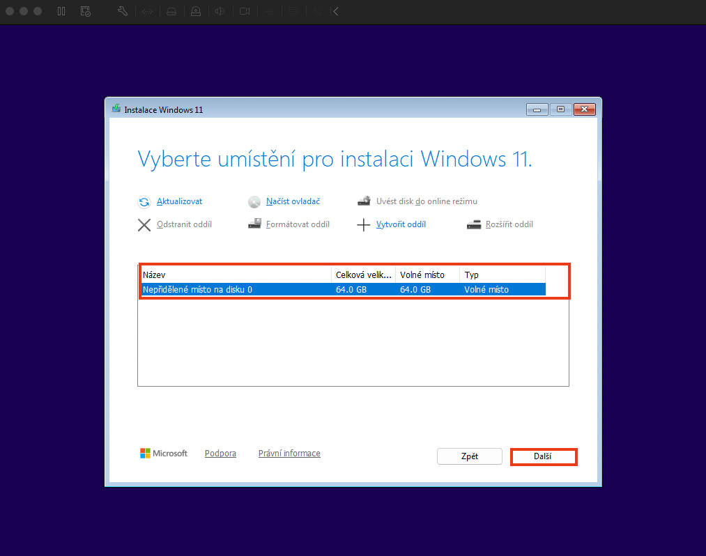 V dalším kroku ponecháme verzi operačního systému Windows 11 Home a klikneme na Další. Přijmeme příslušná sdělení a licenční podmínky, vybereme jediný dostupný disk a pokračujeme dále v instalaci: